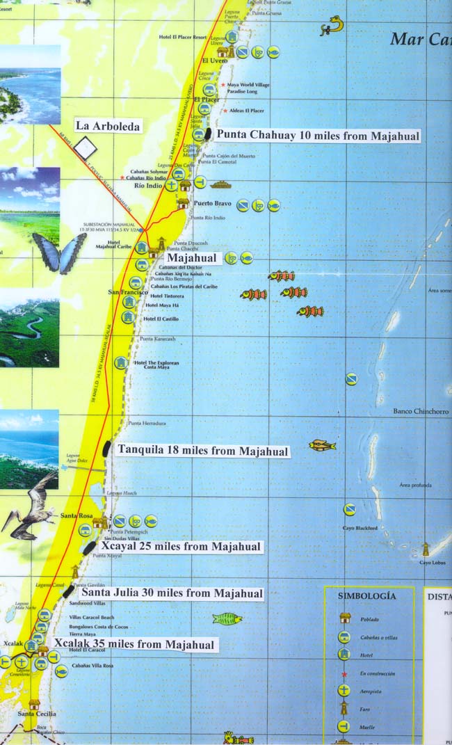 The Riviera Maya and Costa Maya are names that the East coast of the Yucatan Peninsula has recently acquired because of the rapid development of beach resorts. Geographically, the Riviera Maya stretches from Cancun southward to Tulum, along the coast of the Caribbean. Off the coast a few miles away lies the island of Cozumel. These areas are very popular for SCUBA diving and snorkeling, because of the beautiful clear waters of the Caribbean. Also the Mayan ruins and cenotes on the mainland coast are very interesting places for vacationers to visit. Costa Maya is the lower part of the coast from Placer down the coast to the small fishing village of Xcalak. Both parts of the Yucatan Peninsula are in the state of Quintana Roo, or by the abbreviation, Q. Roo. The state capital is Chetumal, but this is an inland city located on Chetumal Bay, just north of the border of Belize. The southernmost Mexican town on the Caribbean coast is Xcalak. We should consider the East coast of the Yucatan in three sections. The northern section, the Riviera Maya, from Cancun to Tulum has been under development for the past thirty years, and has become a widely know resort area. From a small village, Cancun developed into a large coastal city with hundreds of hotels, thousands of rooms, and hundreds of thousands of visitors per year. Just a few years ago, Playa del Carmen was a sleepy little village with a nice beach and the landing pier for the ferry to Cozumel. Now it has developed into a large resort area with luxurious hotels and resort type residential housing developments. A four lane freeway connects Cancun with Both Tulum to the south and Merida to the west. The center third of the Yucatan East coast has been reserved as a "Biosphere." There are two large bays, but development will be almost non existent by design, controlled by severe subdivision and building restrictions. It is good to keep this area of the coast reserved for the ecological benefit of this part of the Caribbean coast. There are two other geographical features of great importance. One is the barrier reef that runs the entire length of the Yucatan East coast from Cancun all the way to Ambergris Cay, Belize. This is the second longest barrier reef in the world, and is invaluable for protecting the beaches in most areas from erosion. It also provides a convenient area for protecting boats at anchor, making harbors unnecessary. The second is Banco Chinchorro, which is a very large reef located 18 miles offshore from Costa Maya. The reef is one of only four atolls located in the Caribbean. The significance of this reef should not be underestimated because of its size and ideal SCUBA and snorkeling conditions. The reef is larger than the island of Cozumel, being 28 miles long and 11 miles wide. The entire reef is about three to twelve feet below sea level, with three small, uninhabited points of land above water. The fact that Chinchorro offers pristine diving conditions is of great importance. Until now, the infrastructure has not existed to support diving operations on this remote reef. With the development of the dive industry along Costa Maya, we expect Banco Chinchorro to rapidly become one of the most important dive sites in the Caribbean. Development of the Costa Maya, the lower third of the coast started in 1998. Before then, you could only get to Majahual by taking Highway 307 south from Tulum for a couple of hours to an obscure turn-off eastward to the beach about fifty miles away from the main highway. After arriving at Majahual you could then turn south again for 35 miles on a beach road so bad that it took two hours to make the 35 miles to Xcalak. Once there you felt like you were in the most desolate place in the world, and this was very close to the truth. Xcalak boasted of a population of 500, but to this day, we have never been able to count more than 41 people in sight any time we drove through the quaint little village. Xcalak and Majahual are still undeveloped, but this will soon change. In 1998, a new paved road was constructed from Majahual to Xcalak parallel to the old beach road, about one mile inland. The travel time was reduced from two hours to forty minutes, and the resulting effect on the traveler's attitude is astronomical. Secondly, the little airstrip at Xcalak was increased in length and width, and a new airstrip, complete with terminal was constructed near Majahual. There is no jet capability, but it brings these areas a shuttle flight away from Cancun, Cozumel, and Merida. The third and probably the most important action was the starting of a cruise ship pier at Majahual. The pier is scheduled to receive its first cruise ship December 2000. Why a cruise ship pier? What will the tourists see and do? Well, at first, not very much except beach and jungle. The object is to have a marvelous Caribbean resort with nice hotels, restaurants, shops, and a lot of fun things to do. But what has to come first, the chicken or the egg? Even if you don't like cruise ships, you have to respect the fact that they transport a lot of people. And the people are the market for activities that will suddenly spring to life, like plants and animals in the desert that have been waiting for the first rains of the year. Within a few years, even a few months, SCUBA and snorkel shops will appear, then beach palapas offering margaritas & cervezas, then restaurants with fajitas, enchiladas, and fresh fish. More and more cruise ship tourists will return for full vacations. Then as the cruise ships double and triple their tourist cargo per year, more and more of the infrastructure will develop. Villages for workers will increase in size, developments for retirement homes, more dive shops, restaurants, hotels will appear, then grocery stores, hardware stores, markets, and other support businesses will develop. Good or bad, it has started and it will happen, and at an alarming rate. Property values will escalate as the beach property is bough